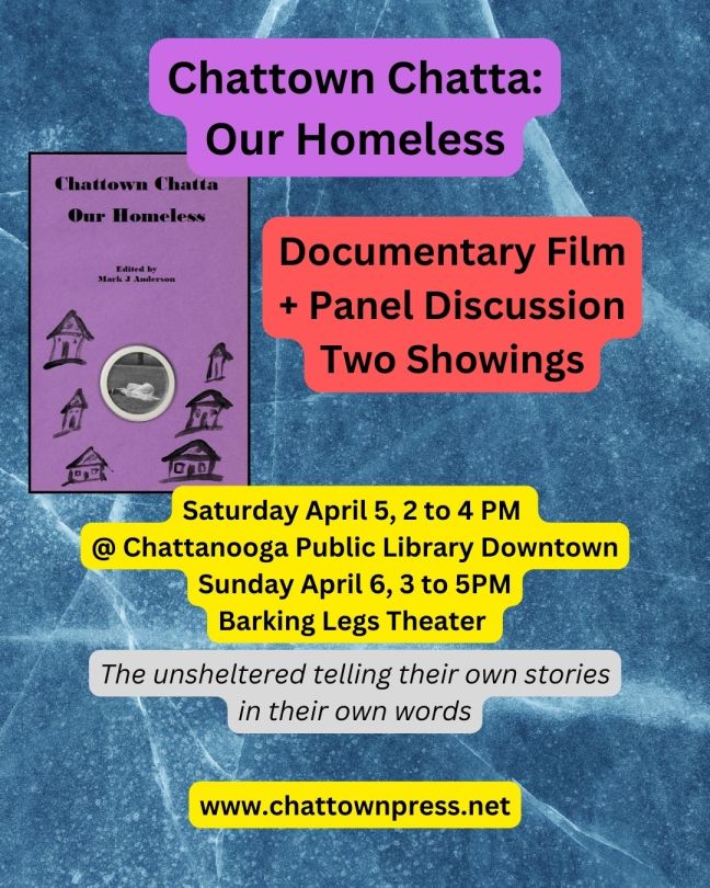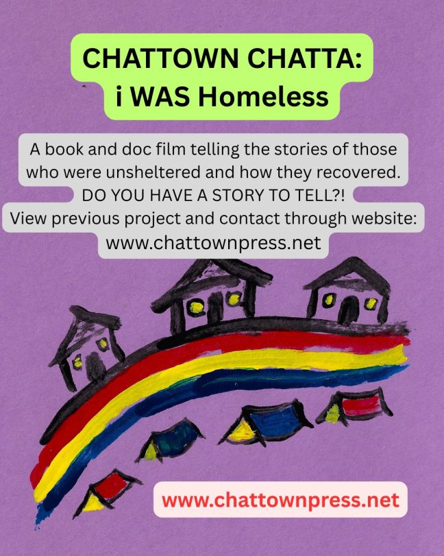 The current project of ChatTown Chatta is finding people who were once living unsheltered to tell the story of their homeless life and especially how they recovered to gain housing. We want to know what the important steps were, how you connected to resources, advice to others. We want to hear your story in your words. These stories will be recorded interviews transcribed for a book and edited into a documentary film. Please use the contact form on this website or email chattownpress at gmail